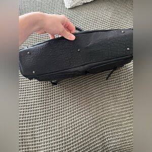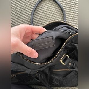 This is the Aerin made by Sundance in Italy of Italian leather. Leather has a pebbled texture. Nice large bag that will hold everything. Doctor’s bag Satchel style. Top zip plus two zippered front pockets. Inside lined in heavy cotton twill and has poachers and a zippered compartment. A classic bag with zip designed and built to last for years. Sure to be a favorite. 18 inches long.