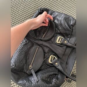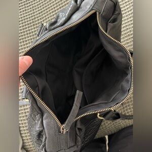 Like new! Minimal signs of wear. The bag is missing one leather zipper pull on one of the front small packets. No stains on interior or exterior.