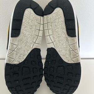 Stylish Nike Air Max sneakers. Features a white base with black accents. Bold yellow swoosh for a pop of color. Comfortable and trendy design.