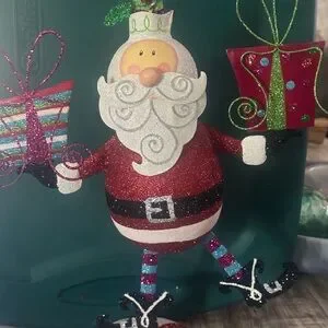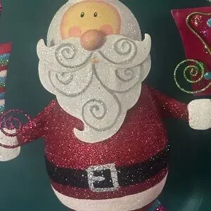 Add a touch of holiday cheer with this charming Santa Claus ornament. Featuring vibrant red and white colors, this festive decoration is perfect for your holiday home decor. Pier one metal jolly Santa . One slight hole at bottom - cannot be seen and does not effect standing .