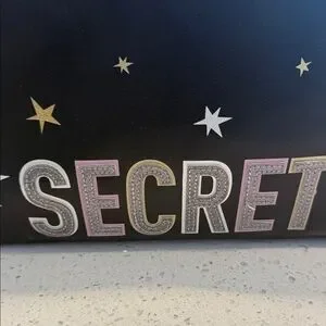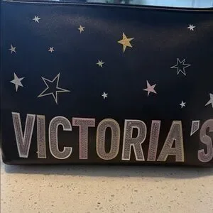Elegant black bag with star designs. Features bold Victoria's Secret logo. Ideal for cosmetics.