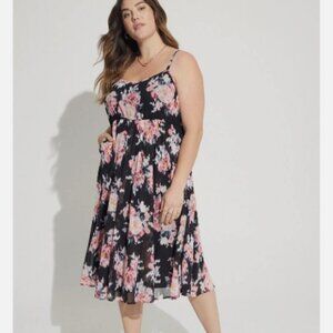 Add a touch of elegance to your wardrobe with this stunning Women's Midi Chiffon Pleated Dress in Black Floral, Size 1. The dress features a beautiful floral pattern and a V-neckline that adds a touch of femininity to the outfit. It is made of high-quality polyester material with chiffon fabric type that offers a comfortable and lightweight feel. The sleeveless dress comes with a pullover closure and is perfect for casual occasions. The pleated accents and midi dress length make it a versatile option that can be worn throughout all seasons, whether it's winter, summer, fall, or spring. This Torrid brand dress is designed with plus-size women in mind