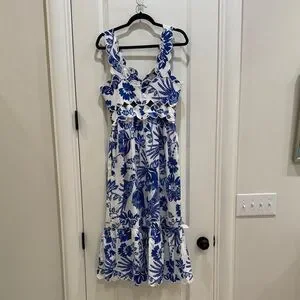 Charming midi dress with bold blue floral design. Features ruffled straps and hem. Ideal for stylish outings.