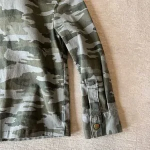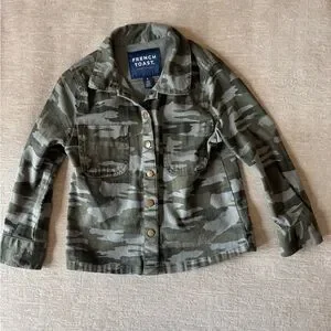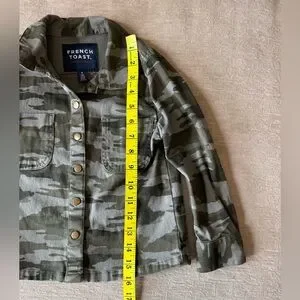 Trendy French Toast kids camo jacket in size 5. Army green camouflage print with front snap buttons, chest pockets, and long sleeves. Perfect lightweight coat for layering in fall or spring. Gently used with no flaws.