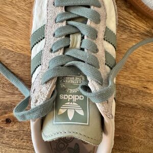 Classic Adidas Samba sneakers in colors Silver Green/Putty. Used and in good condition. Some fading of green strips onto fabric which can be seen in photos.