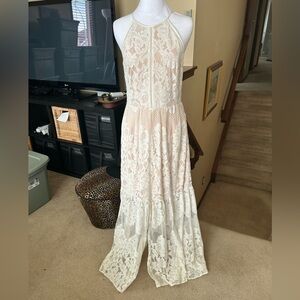 Does not have a size tag. Made of nice light fabric with touching at the sleeve. Open front. Non stretch fabric.
