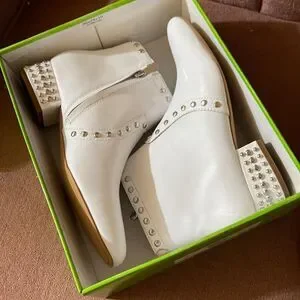 Sam Edelman White Silver Studded Lorin Booties, size 9.5, New in Box ( No lid on box), black marks on bottom by heel, see pics.