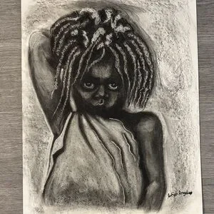 Expressive charcoal portrait of a child with intricate details. Comes already Framed and is signed by the Artist.