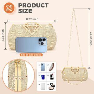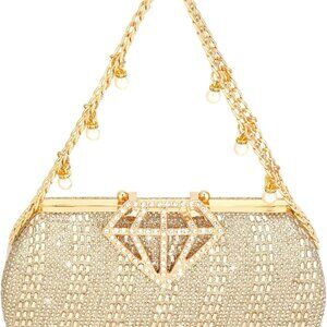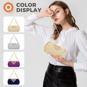 Features: This elegant clutch is inlaid with two different shapes of crystal rhinestones that catch the light beautifully. The diamond-shaped clasp adds a touch of sophistication, while the pearl chain can be worn as a crossbody or shoulder strap. The soft polyester lining feels luxurious and helps protect your essentials.