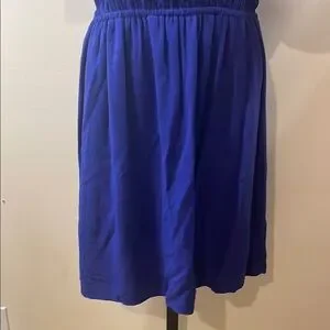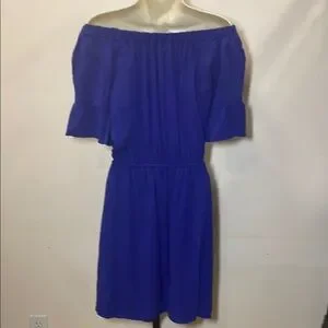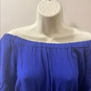 Elegant off-shoulder dress in a striking blue. Perfect for any occasion. PTP 16”, is waist is 11” and stretches to 16”, length is 34”