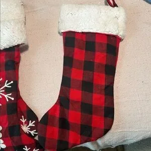 Festive red and black plaid Christmas stockings with white snowflake designs. Perfect for holiday decor.