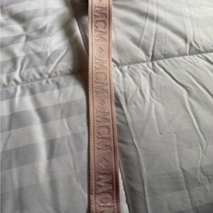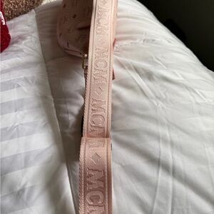 Elegant MCM crossbody bag in light pink. Features signature logo pattern. Perfect for daily essentials.