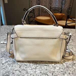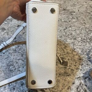 Elegant white bag with black floral studs. Features top handle and detachable strap. Silver hardware accents.
