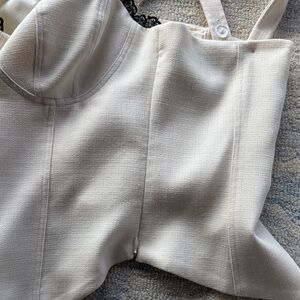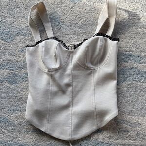 Chic cream bustier with elegant black lace detail. Ideal for a sophisticated style.