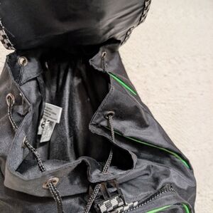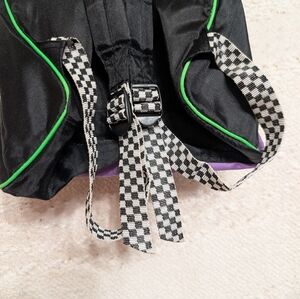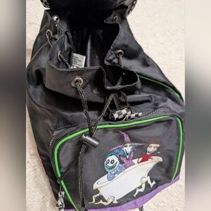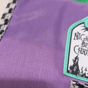 Stylish backpack featuring Nightmare Before Christmas design. Purple and black with green accents. Perfect for fans.
