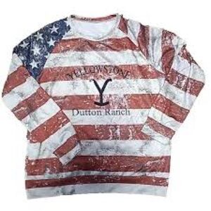 Patriotic long sleeve shirt with American flag design. Features 'Yellowstone Dutton Ranch' text.
