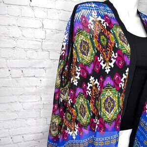 Gorgeous colors! Sheer open front cardi from Angie. Sleeve holes on sides. 100% polyester. Excellent condition. Flowy and roomy.