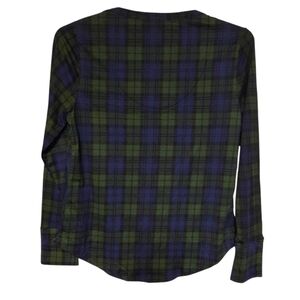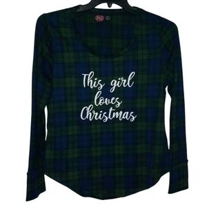 Santa's Treasures long-sleeve pajama top in size medium. The multicolored plaid design is primarily blue and green. The front reads, "This Girl Loves Christmas." The material is a soft, stretchy, and smooth lightweight blend of 95% polyester and 5% spandex. Features a curved hem and is machine washable.