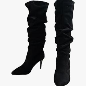 These black heeled boots boast a knee-high length and a relaxed slouchy design, perfect for a chic look. Made from a soft, suede-like material, they offer a luxurious feel. The high, thin heel and pointed toe add a touch of elegance and sophistication.