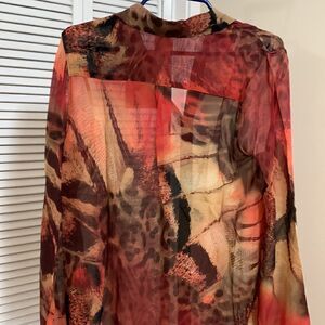 Stylish sheer blouse with abstract patterns. Button-up front. Lightweight and breathable.
