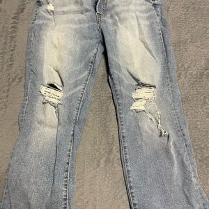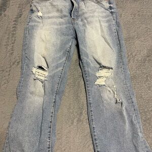 Chic straight leg jeans with distressed details. Light blue color. Ideal for casual wear.