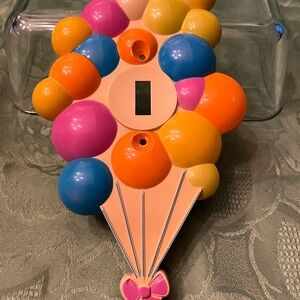 Brighten up your room with this colorful balloon-themed light switch cover. Features vibrant pink, blue, orange, and yellow balloons.