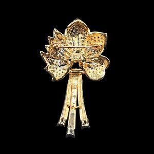 This is a gorgeous vintage brooch with incredible sparkle. It's art deco revival in style, but was made in the 1980s. Crafted in a radiant flower or orchid design, with attached streamers, covered in white or clear faux diamonds (Swarovski crystals). It's accented with blue round-cut faux sapphires (dyed cubic zirconia).