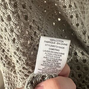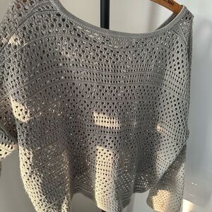 Elegant light gray knit top with intricate design. Ideal for layering.