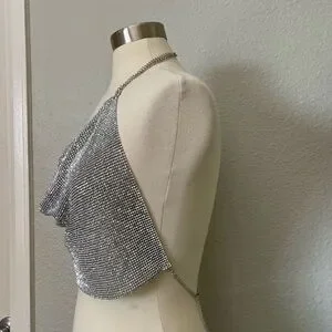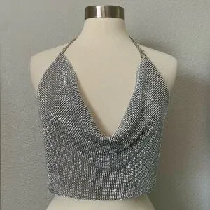 Stylish silver chainmail halter top with a draped neckline. Perfect for a night out.