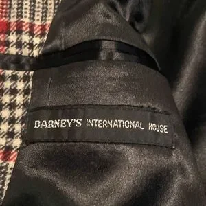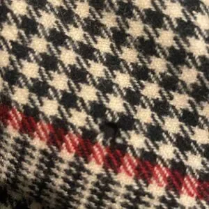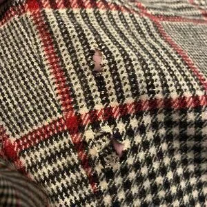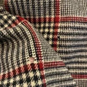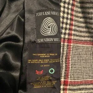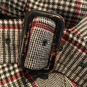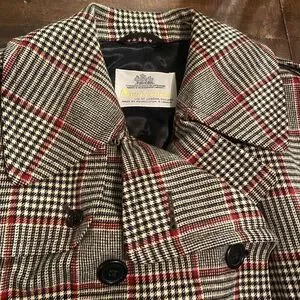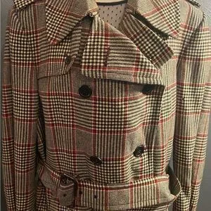 Stylish plaid trench coat with a belt. Features a classic black, white, and red pattern. Perfect for a chic look. Due to the age there are moth holes throughout but still a beautiful statement piece. See pictures. Fits like a oversized ladies large