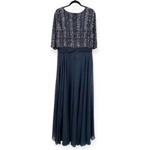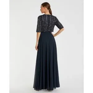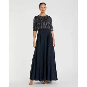 Mac Duggal Chiffon Gown w/ Fully Beaded 3/4 Sleeve Top in Navy