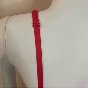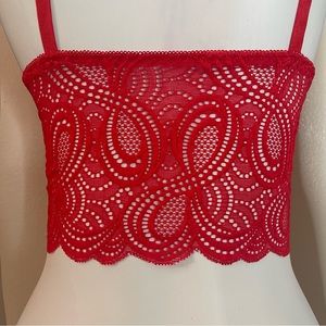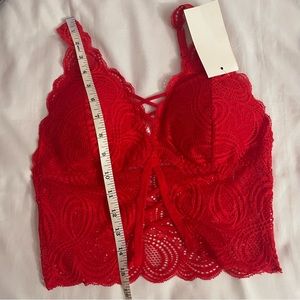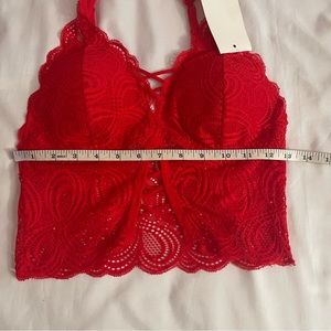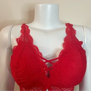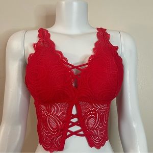 Red scalloped trims removable pads crisscross front Vneck lace bralette