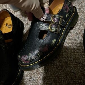 Chic Dr. Martens loafers with a floral pattern. Black leather with purple accents. Stylish and comfortable for everyday wear. With pretty flowers hardly worn