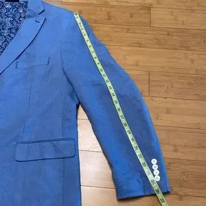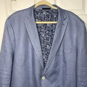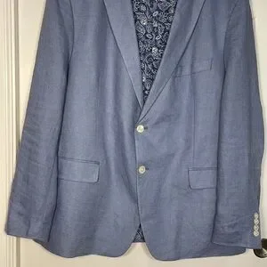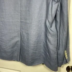 Fully lined single breast two button linen men’s blazer with front pockets (still stitched up), inside pockets and a vent on the back