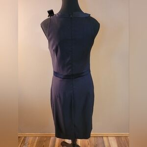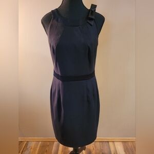 Canadian made, Jacob, sleeveless little black dress. This garment features a zipper closure in the back, a classy bow on the left shoulder, a satin band around the waist and pleats at the waist.