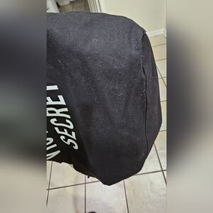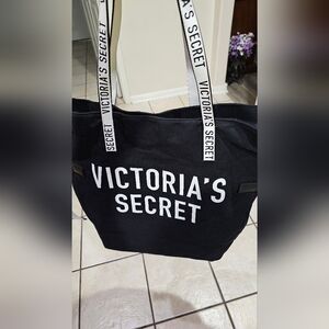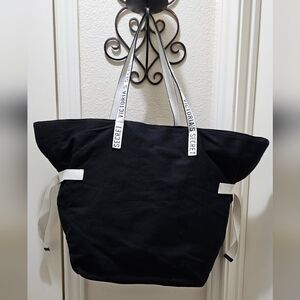 Excellent used condition Victoria's Secret Black canvas tote in Bright White graphic design and side adjustable straps. No frays or callouts. Measures 22 inches by 15 inches by 5 inches, has 10 inch long handles. Chic and versatile tote, in durable canvas with open top, one interior side pocket, fully lined interior. With bold branding, this tote is ideal for daily essentials to work, gym, beach,or travel in style. Ships from smoke-free and pet free home.