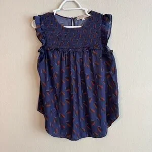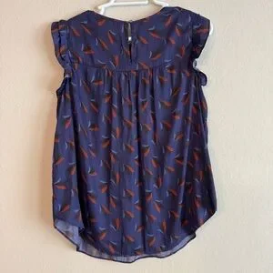 Chic sleeveless blouse. Features ruffled/flutter sleeves. Blue with orange feather pattern.