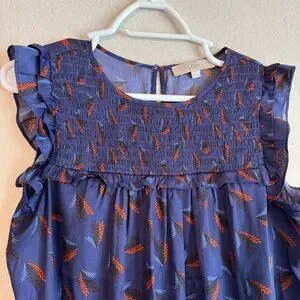LOFT Flutter Short Sleeve Feather Blue and Orange Blouse Medium