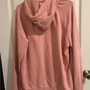 Casual pink hoodie sweater with front pocket. Features drawstring hood and logo on sleeve. Has been worn but is in good condition. No stains or tears. Smoke free home.