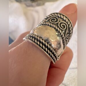 This elegant silver ring features intricate detailing, perfect for adding a touch of sophistication to any outfit. The stretchy band ensures a flexible fit, perfect for any finger size.