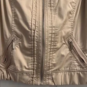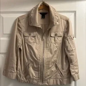 White House Black Market Chic tan utility jacket with front zipper. Features multiple pockets and button details. Ideal for casual outings. Size 4. Excellent Condition!