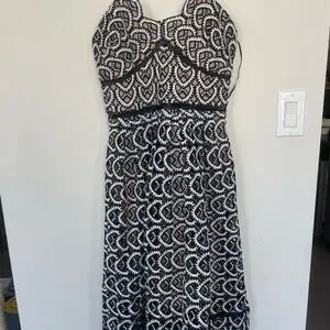 This elegant black and white lace dress is perfect for any occasion. The intricate lace design adds a touch of sophistication and style.