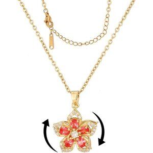 Women's Red Gold Flower Blossom Rotatable Crystal Pendant Fidget Necklaces