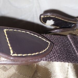 Size 17" X 11". Gold, black with gold tone hardware. Strap drop 8". Comes with adjustable removable strap. 1 main compartment with 3 smaller compartments, 1 with zip closure. As posted in 2 pictures ,there are 2 places not visible from outside where the straps on each side have peeled on the inner side. Seems to be small crackling on black but very unnoticeable. This is a gorgeous bag.
