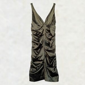 Nicole Miller renders sleek intention in a bronze-olive satin that clings and releases with precision. Tank straps frame a plunging neckline, while sculpted ruching folds across the body in deliberate ease. The midi cut strikes balance between allure and structure, carrying confidence into evening hours. A size 12 petite, it commands presence without excess.