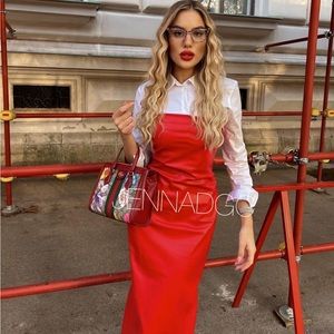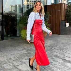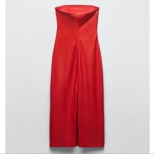 NWT Zara Red Faux Leather Strapless Midi Dress Xsmall