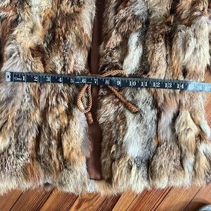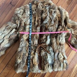 Experience elegance with this luxurious brown, tan, and cream fur jacket. This vintage piece captures the essence of early 1980s fashion. It features a cord tie at the waist and is unbranded with no size label, so please refer to the measurements. It appears to fit sizes XXS or XS, particularly for those with smaller shoulders. This jacket is perfect for adding a touch of sophistication to any outfit. Lined. Pockets.