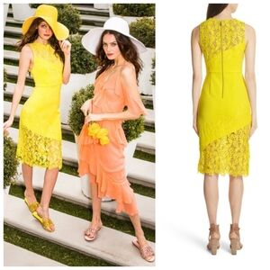 This stunning Alice + Olivia Margy Floral Guipure Lace Midi Dress in size 4 new witjout tag, is a must-have for any fashion-forward woman. The dress features a beautiful floral pattern in shades of yellow and is made of high-quality lace fabric that is both delicate and durable. The bodycon style and midi length make it a perfect choice for any occasion, while the flower theme adds a touch of femininity to the overall design.