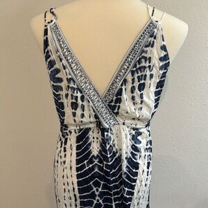 Step into resort elegance with this Signature by Sangria sundress, showcasing a captivating black and white design. The sleeveless, V-neck silhouette offers a relaxed yet chic look, perfect for sun-drenched getaways. Its flowing maxi length ensures both comfort and style, making it an ideal choice for leisurely days.