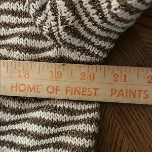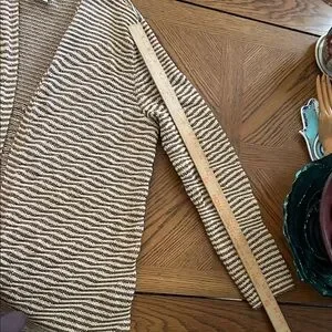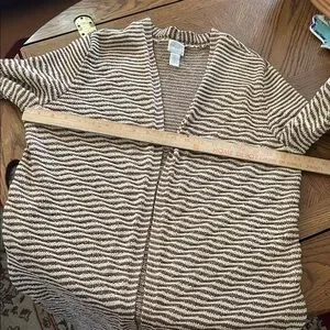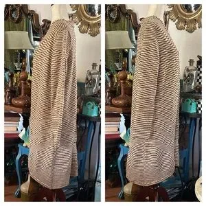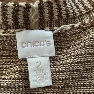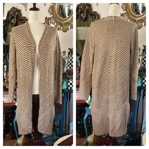 CHICOS Gold Metallic & Cream Stripped Open Knit Sweater Cardigan Duster ~ Perfect for layering and adding a touch of elegance to your outfit. Size 2 is a CHICO’s Size 12/Large. Stay cozy and stylish! Length is approximately 38”. Pit-to-Pit measurement shown in photo. In excellent condition. Smoke free home. PLEASE NOTE THAT THE COVER PHOTO IS AI GENERATED AND MAY NOT ACCURATELY REFLECT HOW THIS SCARF LOOKS OR WILL LOOK ON YOU SO PLEASE VIEW THE REMAINING PHOTOS AND COMPARE MEASUREMENTS WITH YOUR OWN.